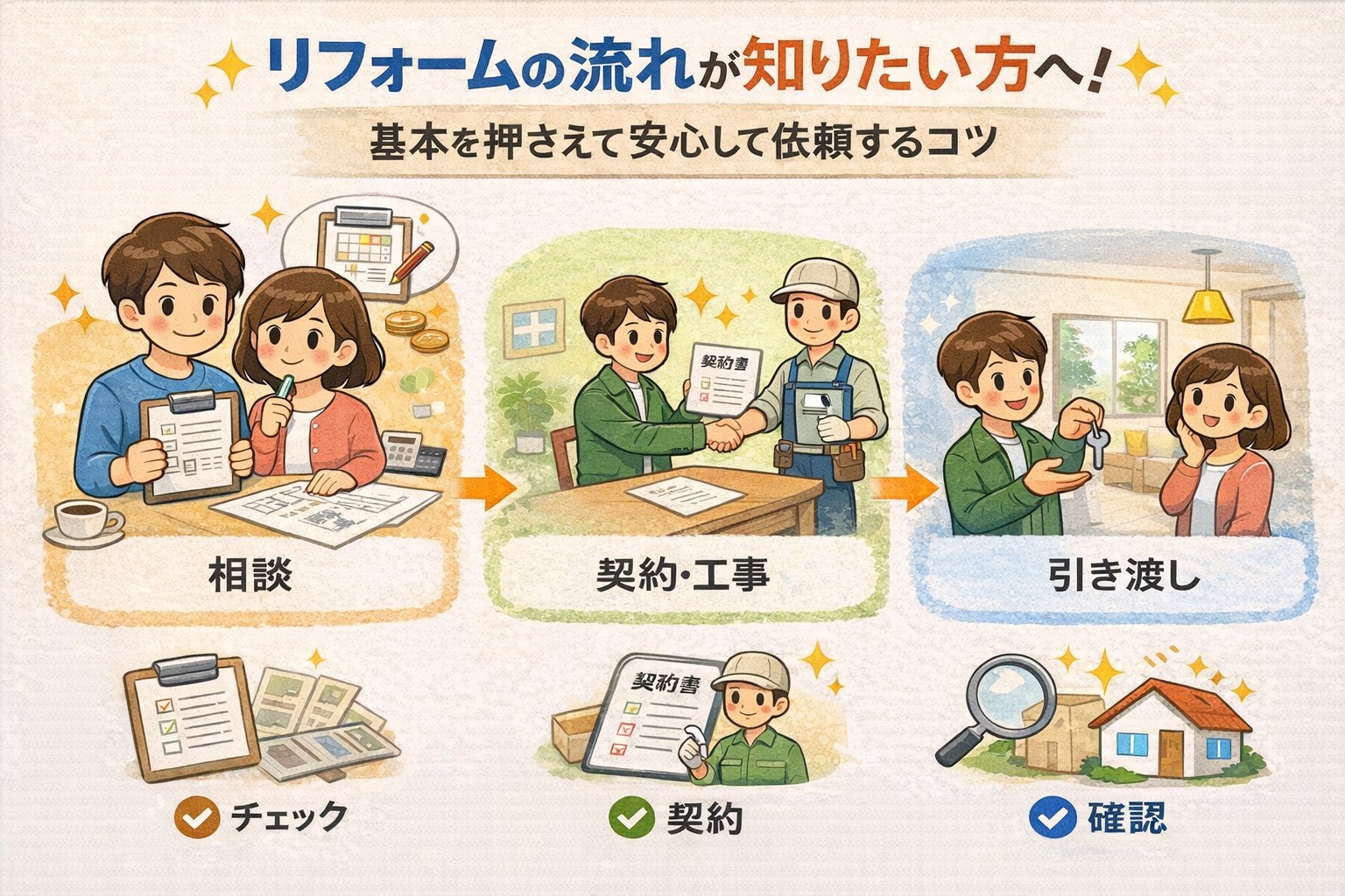 最後に、リフォーム全体の流れをざっくりでも理解しておくことで、不安が軽減します。